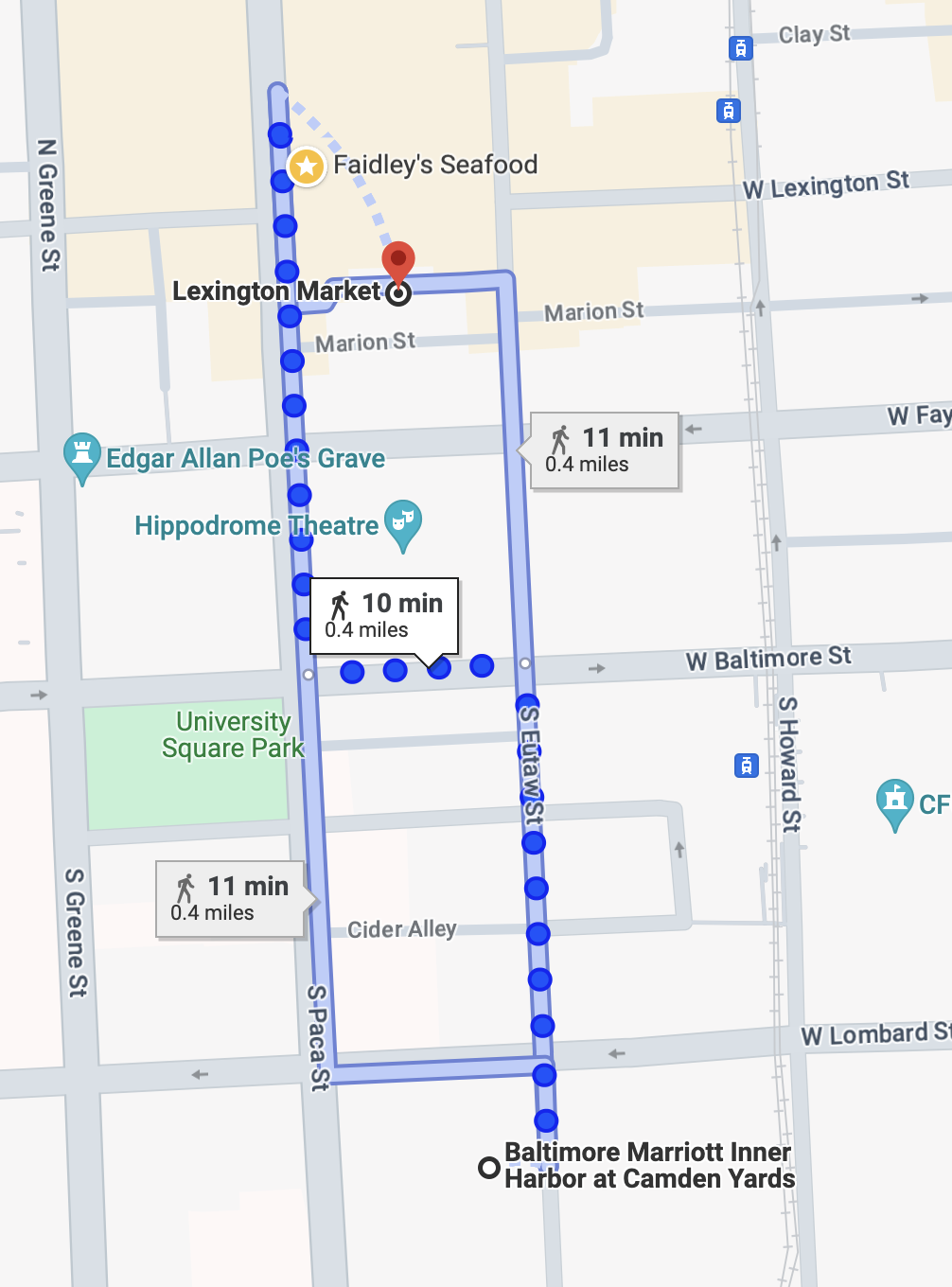 호텔은 볼티모어 다운타운 매리엇 호텔이고 렉싱턴 마켓까지는 0.4마일 (1km좀 안되는)
