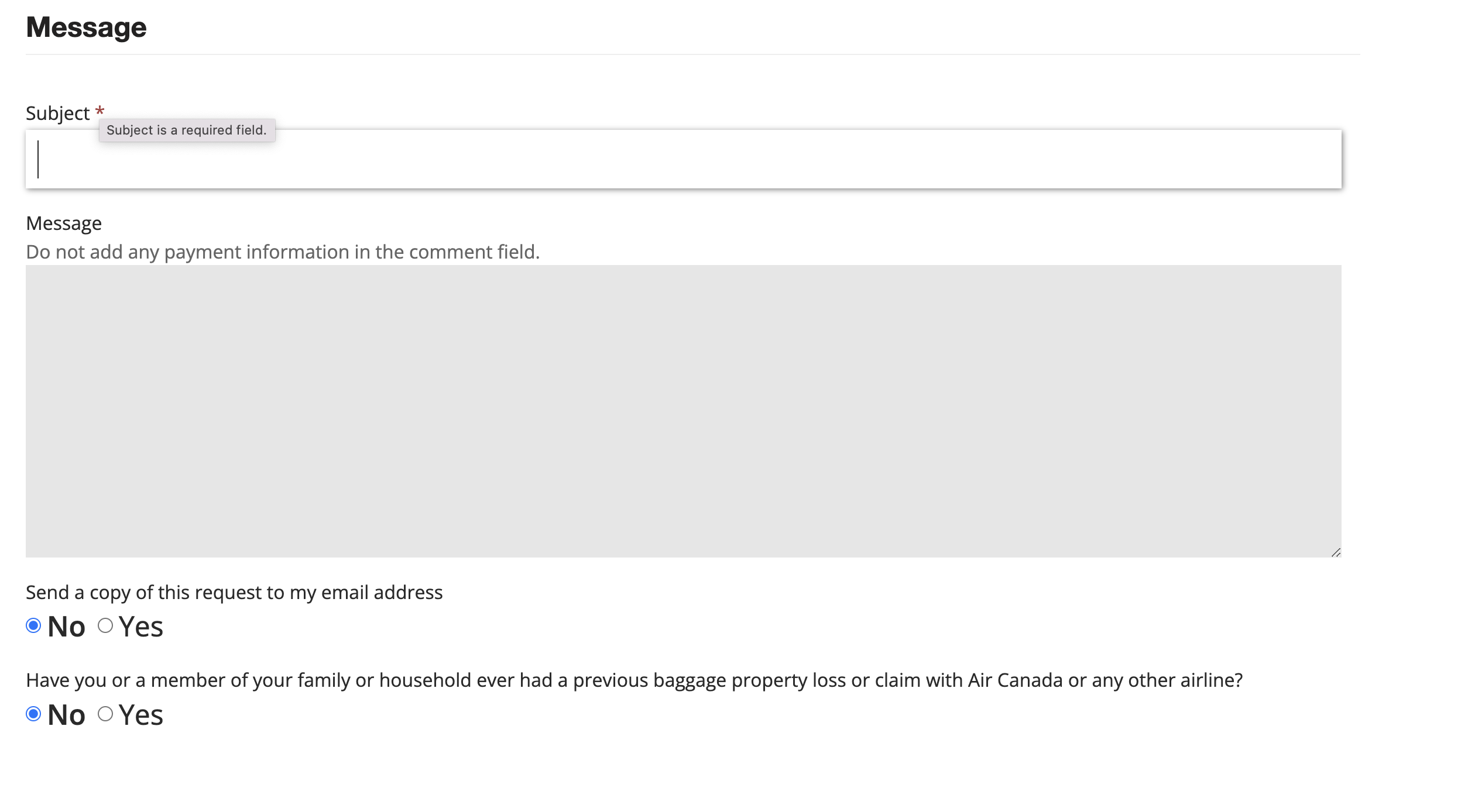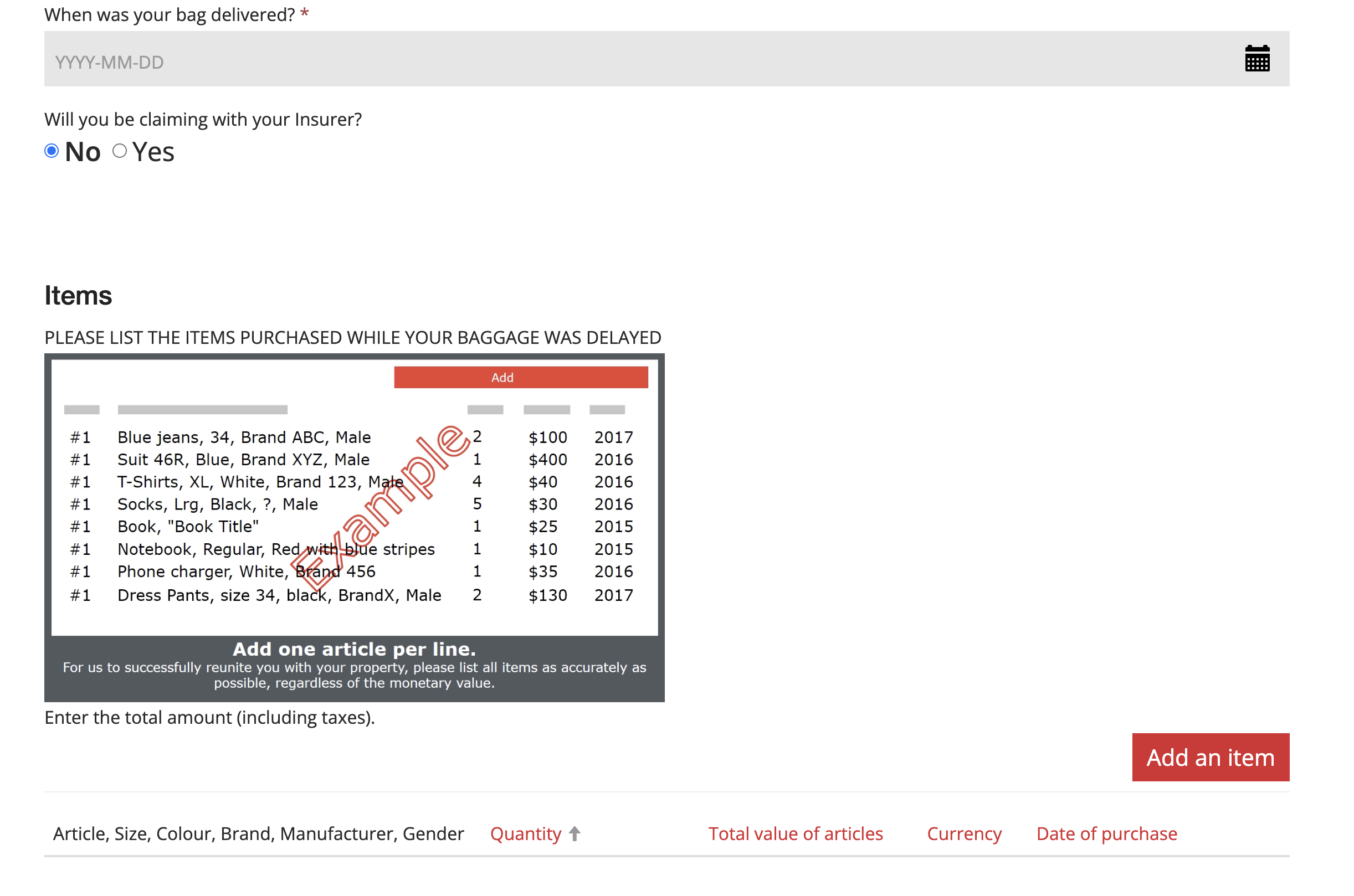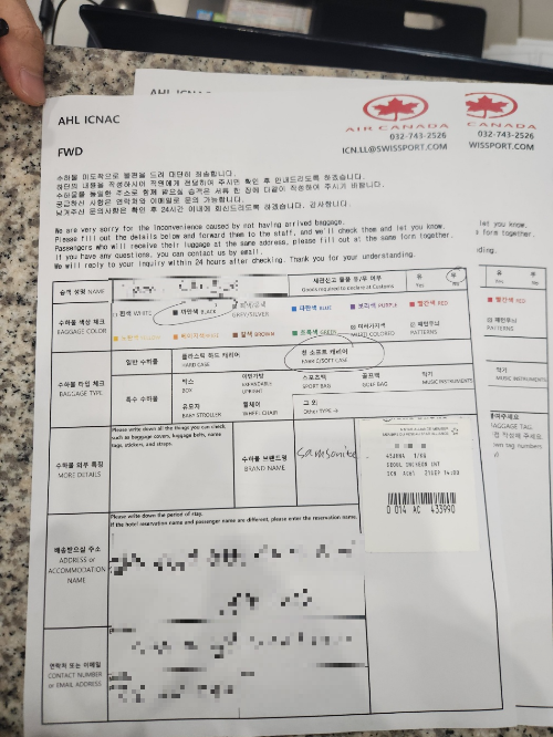 그 다음 페이지에서는 지연된 수화물 정보, 그리고 그 사이에 구입한 물건들 정보를 입력합니다