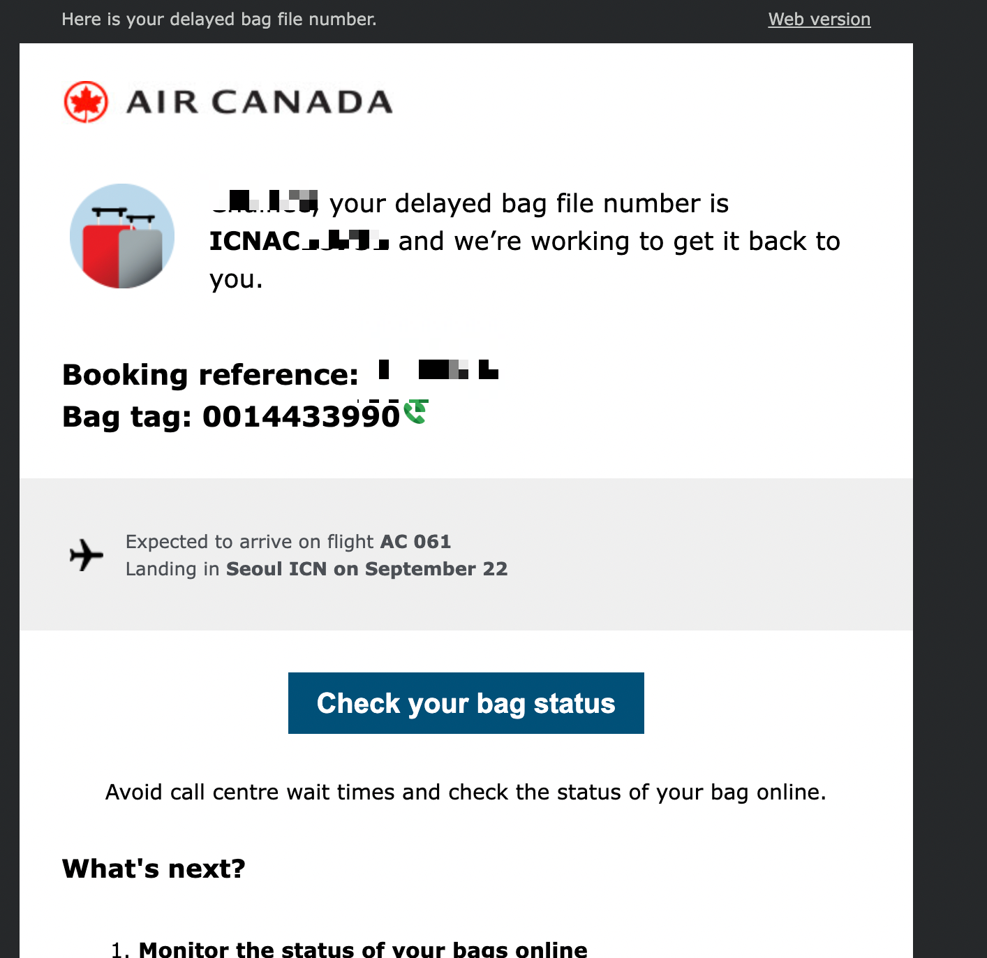 Was the bag reported missing at destination ? 인천공항 고객센터에 신고를 했으니 Yes라 합니다